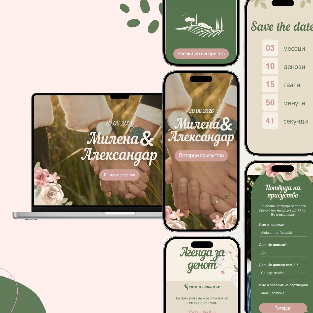 Паметна и персонализирана дигитална покана со сите информации за настанот, интерактивна мапа до локација и потврда на присуство достапни само со еден клик.