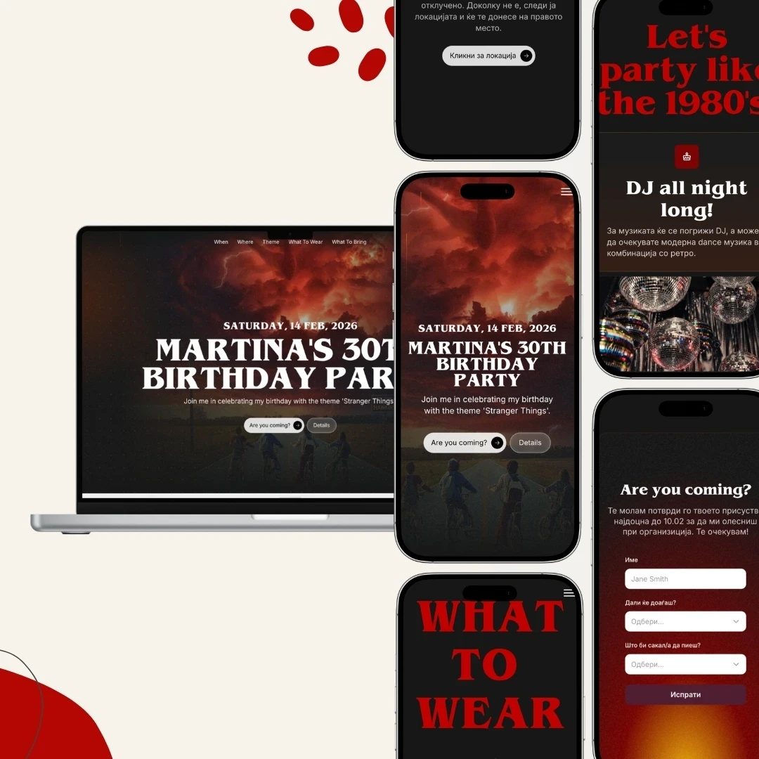 Јас сум Мартина, веб-дизајнер што верува дека деталите ја создаваат магијата. Идејата за веб-покани се роди кога организирав моја забава.