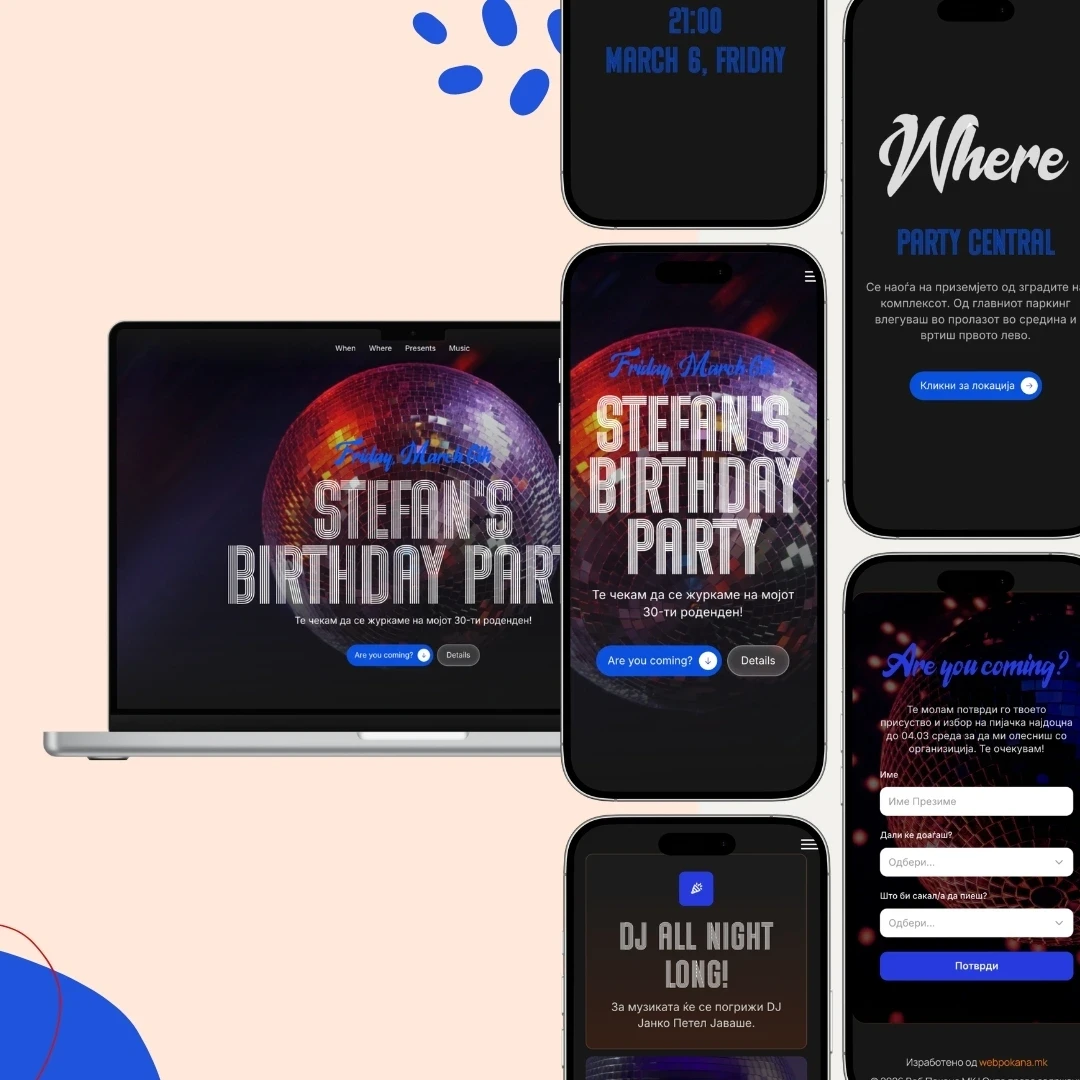 Модерен и динамичен дизајн со сите информации организирани на едно место. Организирањето на приватна забава никогаш не било полесно. Забавата почнува од поканата!